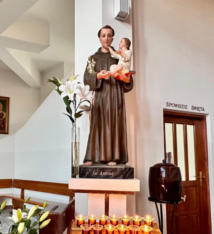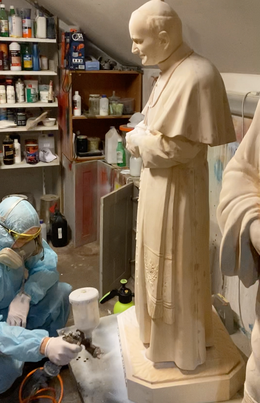 Na prośbę proboszcza wykonaliśmy dwie figury: św. Jana Pawła II oraz św. Faustyny Kowalskiej, w drewnie lipowym, wykończone tradycyjną polichromią, o wysokości około 130 cm. Istotnym założeniem było dopasowanie stylu i skali do istniejących już rzeźb w kościele – w tym do figury św. Antoniego, która stała się punktem odniesienia.
