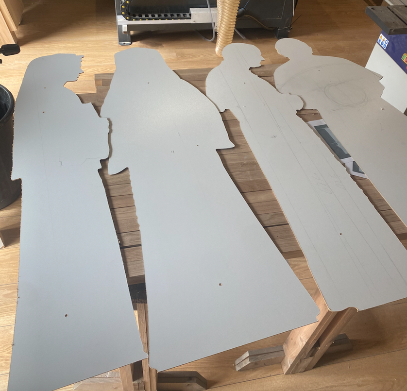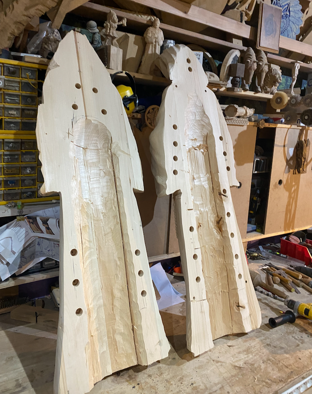 Na podstawie szablonów wykonaliśmy frezowanie poszczególnych elementów. Rzeźby zostały podzielone technologicznie na komponenty, które następnie łączyliśmy śrubami konstrukcyjnymi i drewnianymi kołkami.