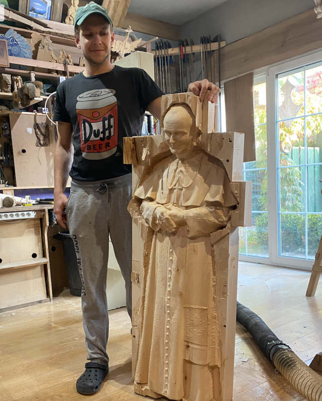 RZEŹBY ŚW. JANA PAWŁA II I ŚW. FAUSTYNY – RZEŹBY DO KOŚCIOŁA NA ZAMÓWIENIE (DREWNO LIPOWE, POLICHROMIA, 130 CM)